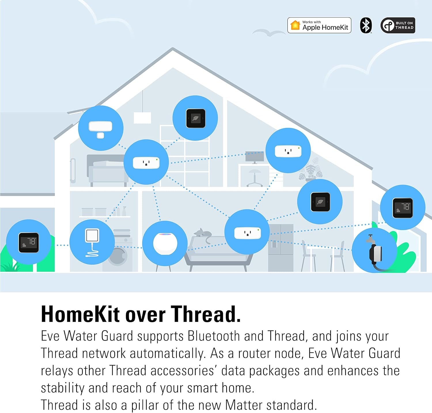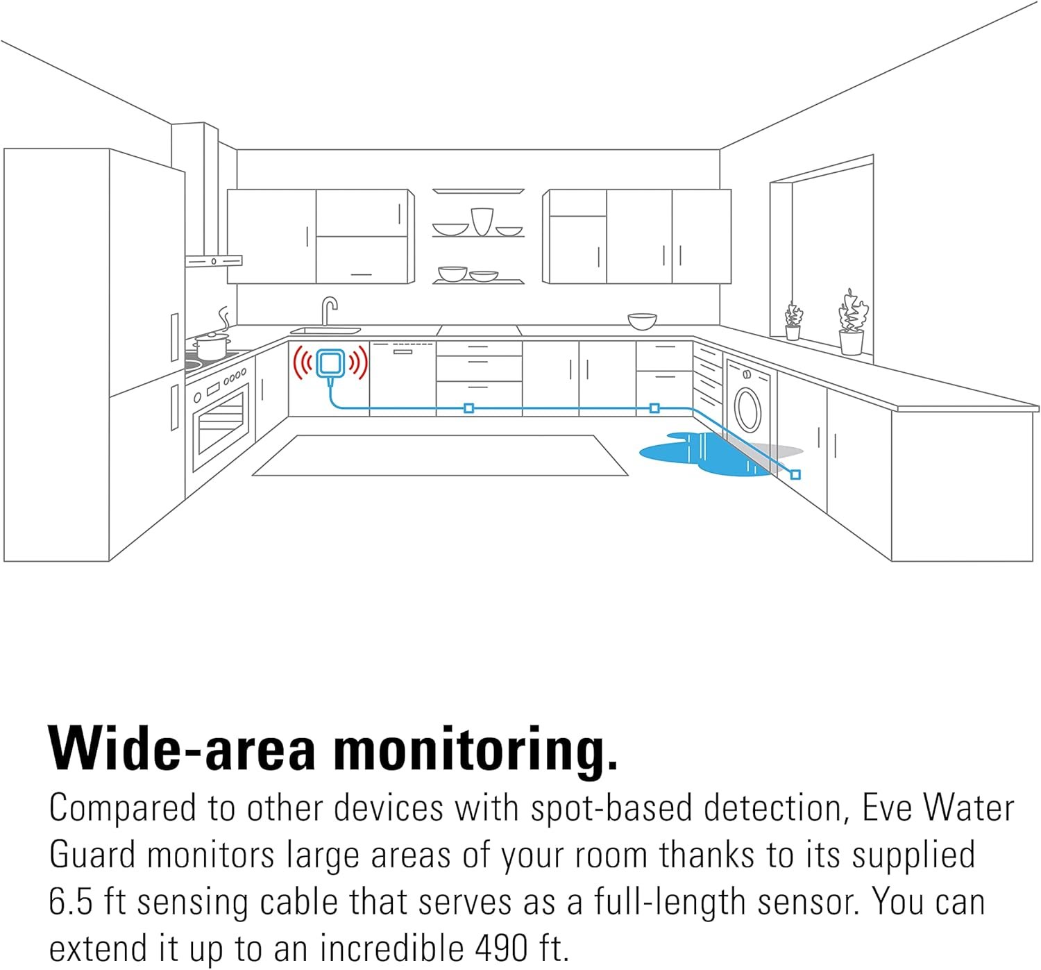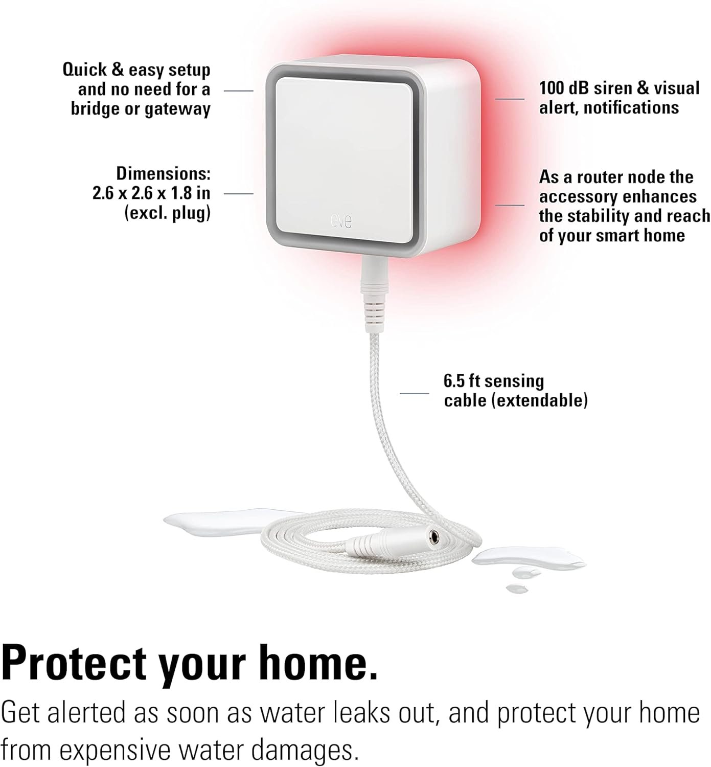 Eve Water Guard is a smart water leak detector that alerts you instantly with a loud 100 dB siren, flashing red light, and notifications on your iPhone, iPad, or Apple Watch. Its extendable 2-meter sensing cable covers large areas, making it ideal for bathrooms, basements, and under sinks. Easy to set up without a hub, it integrates seamlessly with Apple HomeKit for reliable, round-the-clock protection. Safeguard your home and act quickly—stay ahead of water damage with Eve Water Guard.